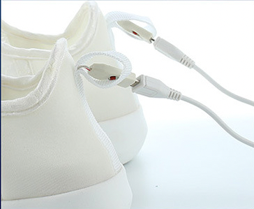 Use the included usb cable to charge the shoes . You can charge both shoes at the same time.